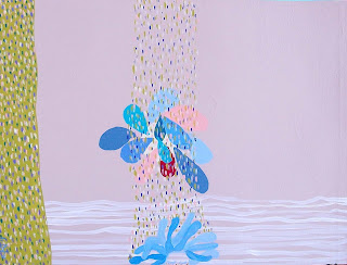 El acercamiento al paisaje es casi abstracto, aparecen ramas de sauces, piletas pelopinchos que devienen en ríos, pequeñas macetas y algunas tunas, todos sumergidos en grandes espacios blancos donde no existen los límites ni tampoco los horizontes. Son telas sin su bastidor, que se continúan con la pared.